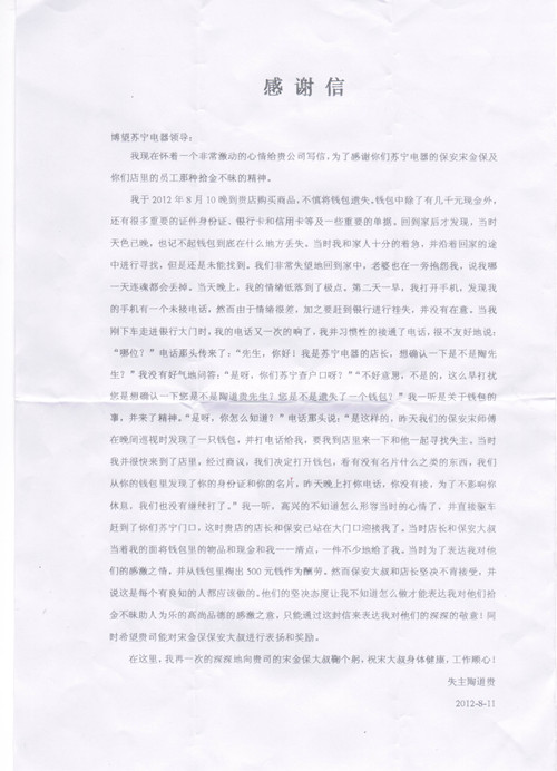 這是一封來自金太陽博望蘇寧電器管理處的感謝信,管理處保安宋師傅夜間巡邏時發(fā)現(xiàn)一只錢包,其中有幾千元現(xiàn)金和很多重要證件。宋師傅及時聯(lián)系該蘇寧電器…